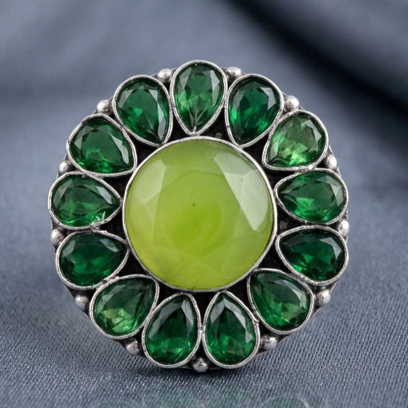 A stylish adjustable ring with a light green-colored center stone encircled by sparkling dark green gems in a silver oxidized finish. Perfect for adding a touch of elegance to everyday outfits or special occasions.