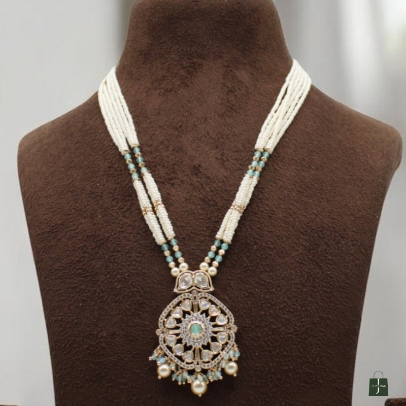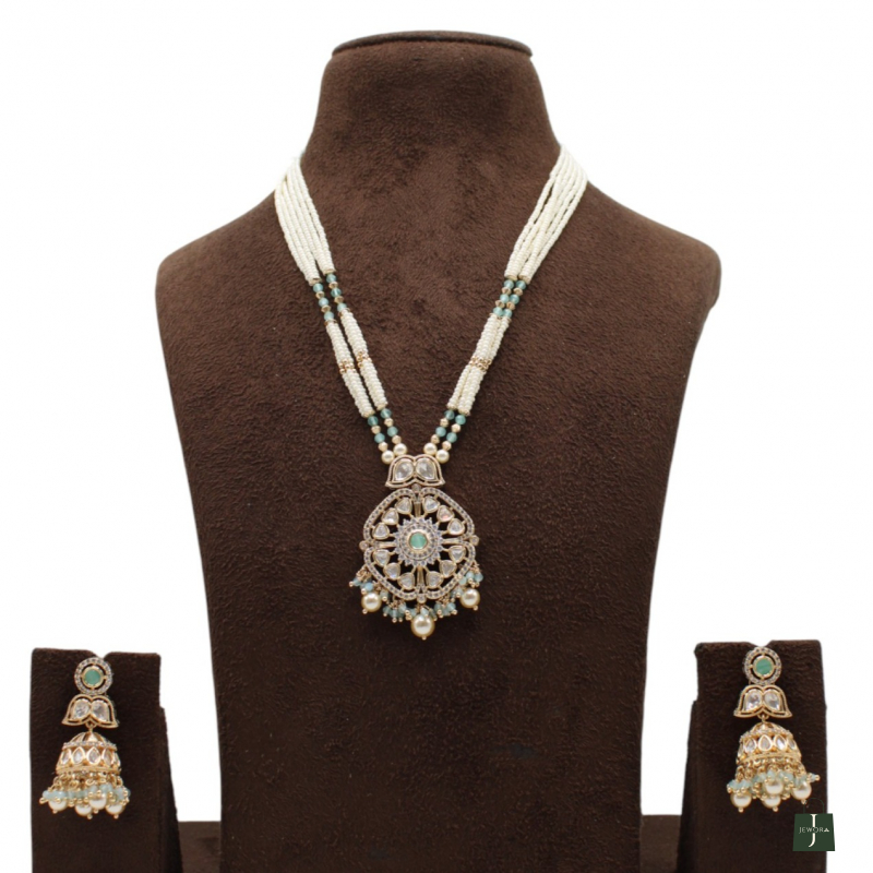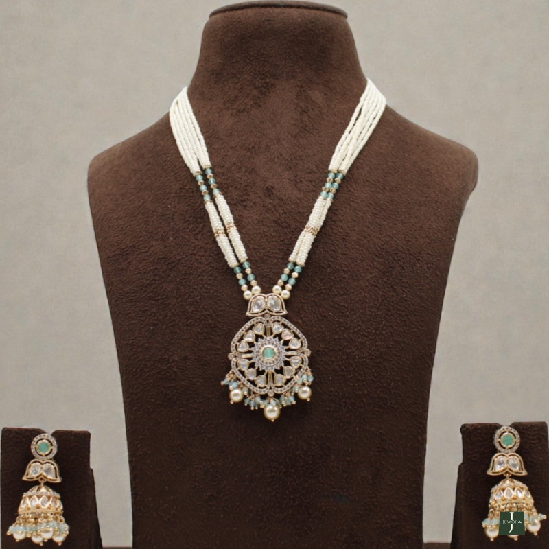 The intricately crafted circular pendant features sparkling white Kundan stones with a mint green center stone, finished with pearl and green bead danglings for added charm. Paired with matching jhumka earrings, this set is perfect for weddings, festive celebrations, pooja functions, and traditional events.