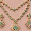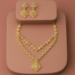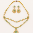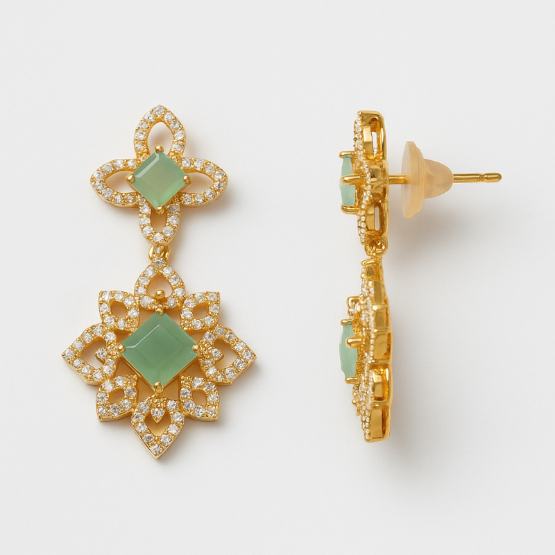 The Mint Sparkle CZ Necklace Set is a sophisticated blend of modern elegance and timeless charm. Featuring a double-layered chain of diamond-shaped American Diamond (CZ) settings interlinked with teardrop and square mint-green stones, this design exudes grace and luxury. The centerpiece pendant mirrors the diamond motif, intricately surrounded by sparkling CZs for maximum brilliance. Matching drop earrings complete the look, offering perfect symmetry and harmony. Plated in a rich rose gold polish, this set is ideal for festive occasions, weddings, or special evenings where you want to stand out. The pastel green stones add a refreshing touch, making it suitable for pairing with both light and dark outfits. Lightweight yet striking, the Mint Sparkle CZ Necklace Set ensures comfort without compromising on glamour, making it a must-have addition to your jewelry collection.