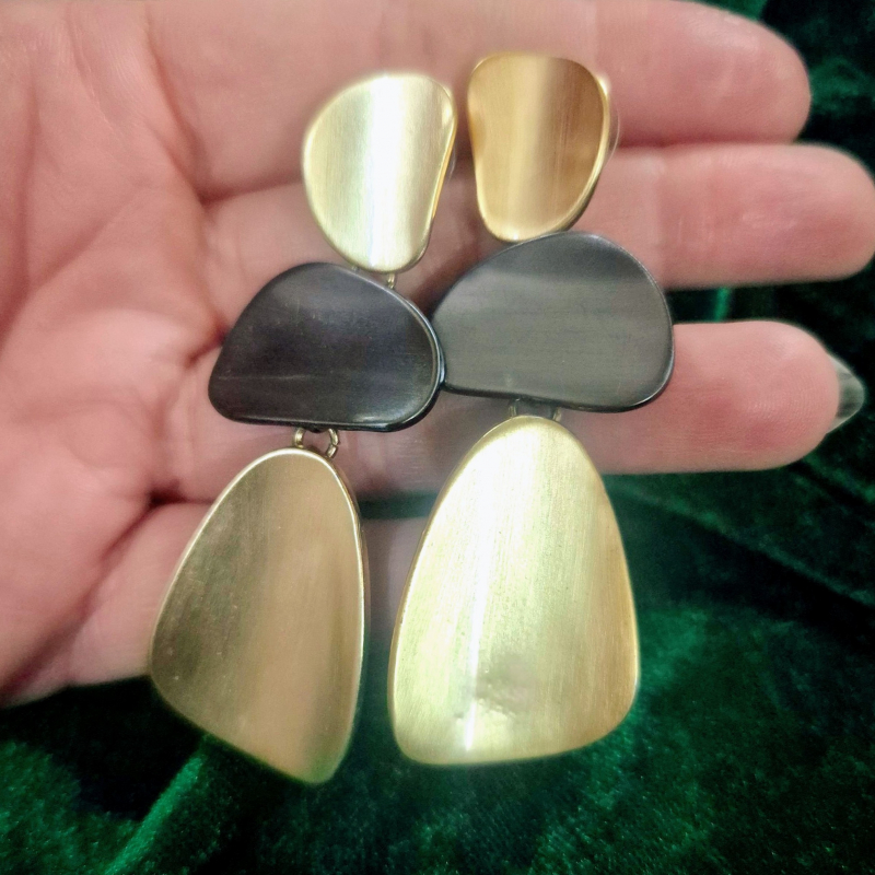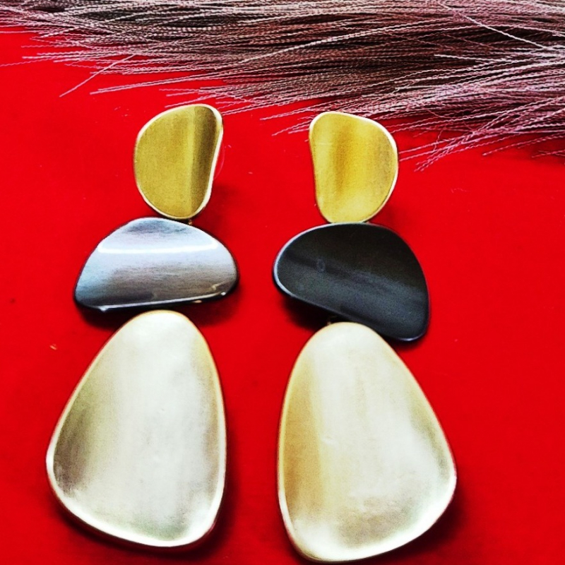Make a bold contemporary statement with these uniquely designed geometric drop earrings. Featuring layered abstract shapes in a striking combination of matte gold and gunmetal tones, these earrings bring a perfect balance of elegance and modern artistry. The brushed finish adds a sophisticated texture, while the lightweight structure ensures comfortable wear. Ideal for elevating western outfits or fusion looks, these earrings are a must-have for fashion-forward styling.