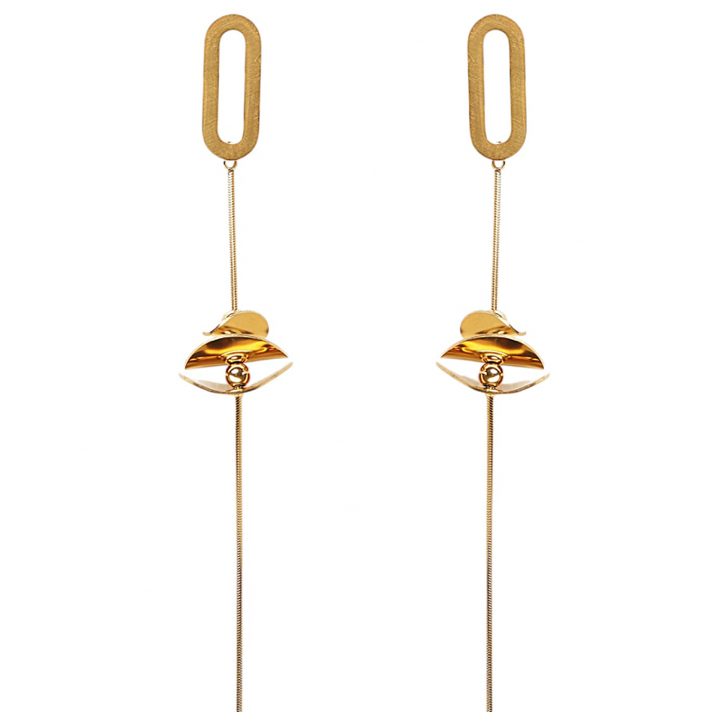 Elevate your style with these modern geometric drop earrings, designed for a bold and contemporary look. Featuring abstract shapes combined with sleek chain detailing, these earrings create a unique flowing silhouette. The rich gold-tone finish adds a touch of luxury, making them perfect for both casual chic outfits and statement evening looks. Lightweight yet eye-catching, these earrings are ideal for fashion-forward women who love minimal yet striking accessories.