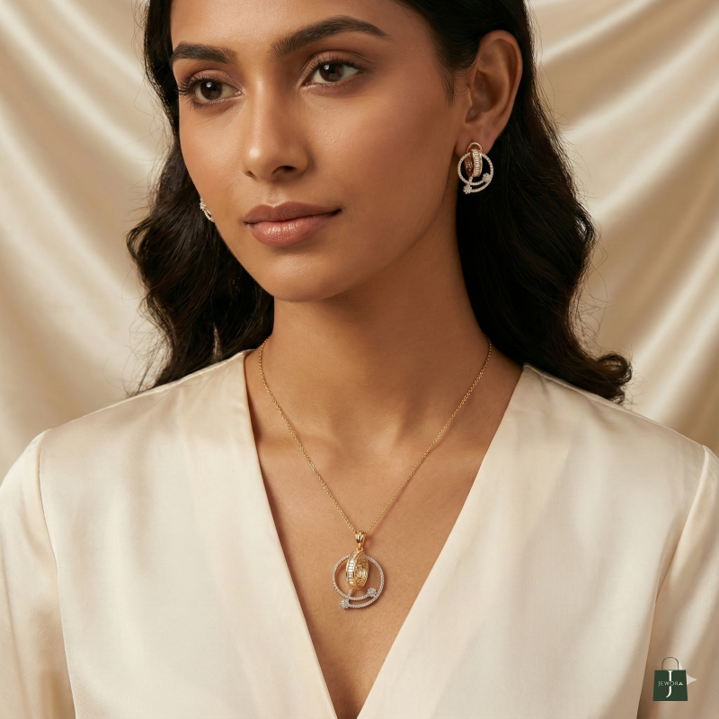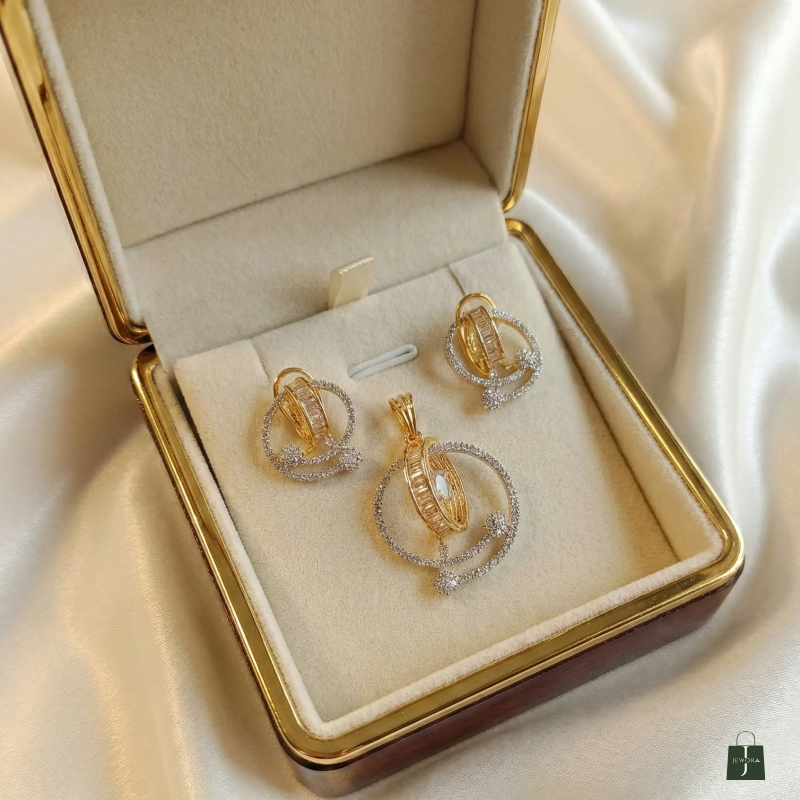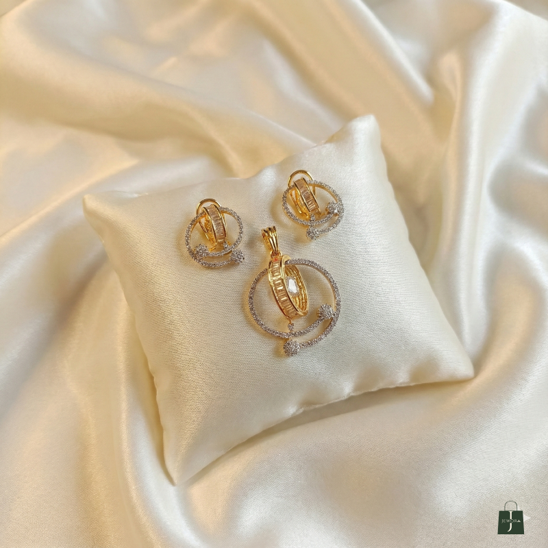 Embrace modern sophistication with this exquisite pendant set. The design features interlocking circles, combining a sleek inner ring with baguette-cut stones and an outer halo of sparkling round crystals. Plated in a lustrous gold tone, this geometric masterpiece creates a unique orbital look, perfect for adding a contemporary edge to both office wear and evening outfits.