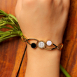 Upgrade your everyday style with this sleek and contemporary bracelet, designed for modern elegance. Featuring a unique trio of circular elements in black, white, and shimmering crystal stones, this piece beautifully symbolizes balance and harmony. The delicate gold-plated frame with infinity-inspired curves adds a stylish and graceful touch.