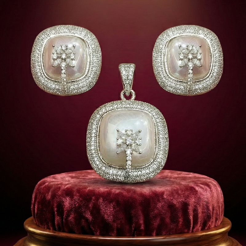 A graceful square-shaped pendant set featuring a luminous pearl centerpiece, framed with shimmering stone detailing and a delicate floral motif. Crafted in an elegant silver-tone finish, this refined design radiates sophistication and timeless charm—perfect for weddings, receptions, and evening celebrations.