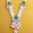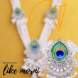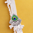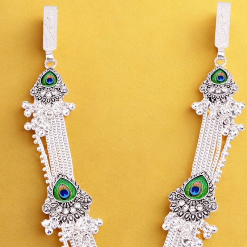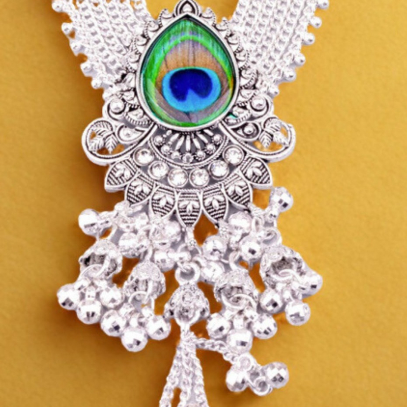 This stunning oxidised silver kamarbandh features elegant peacock feather-inspired motifs placed along the chain, giving it a graceful and royal look. Each segment showcases vibrant green and blue peacock feather detailing, beautifully highlighted with intricate metalwork. Delicate dangling ghungroo-style tassels add movement and traditional charm. Designed to enhance the waistline, this kamarbandh pairs perfectly with sarees, lehengas, and festive ethnic outfits, making it an ideal accessory for weddings and special occasions.