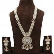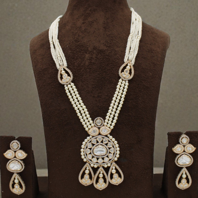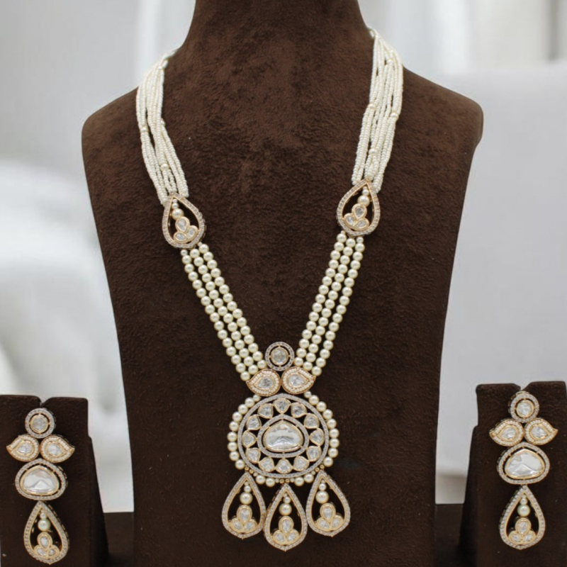 Enhance your ethnic elegance with this stunning Rajwadi Moti Chandrika Kundan Long Necklace Set, designed to reflect royal heritage charm. This beautifully crafted long necklace features multiple strands of fine off-white pearls, gracefully connected to an intricately designed circular Kundan pendant.