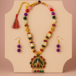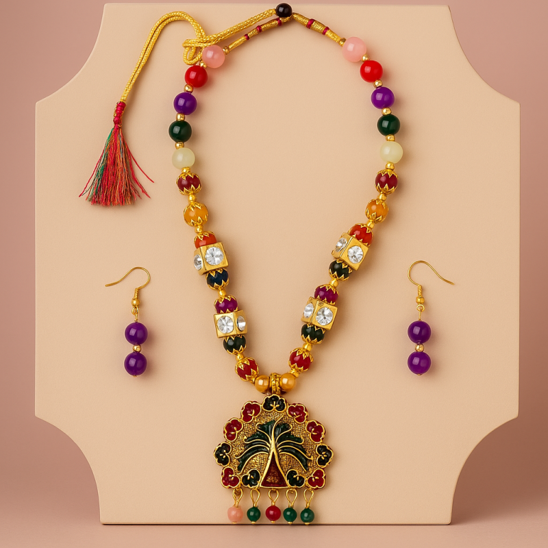 Embrace cultural charm with this exquisite Multicolor Beaded Tree Pendant Set, beautifully designed with vibrant round beads in shades of purple, red, green, yellow, and pink. The highlight is the intricately crafted tree motif pendant, adorned with delicate enamel work and colorful drops, symbolizing prosperity and growth. Paired with matching purple bead earrings, this set offers a perfect balance of tradition and vibrancy. The gold-tone detailing enhances its festive appeal, making it a versatile choice for ethnic gatherings, cultural celebrations, or gifting. The lightweight design ensures all-day comfort while retaining a luxurious look. Wear it with traditional attire to create a statement or pair it with fusion wear for a unique, eclectic vibe. A piece that truly reflects artistry and heritage in every detail.