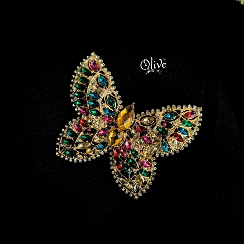 The Royal Prism Butterfly Brooch is a breathtaking statement accessory inspired by the beauty and transformation of a butterfly. Designed with intricately detailed wings, this brooch is embellished with sparkling crystal stones in rich jewel tones, creating a vibrant and eye-catching look. The multicolor crystals—ranging from emerald green and ruby pink to sapphire blue and golden yellow—reflect light beautifully, giving the brooch a luxurious and radiant finish.