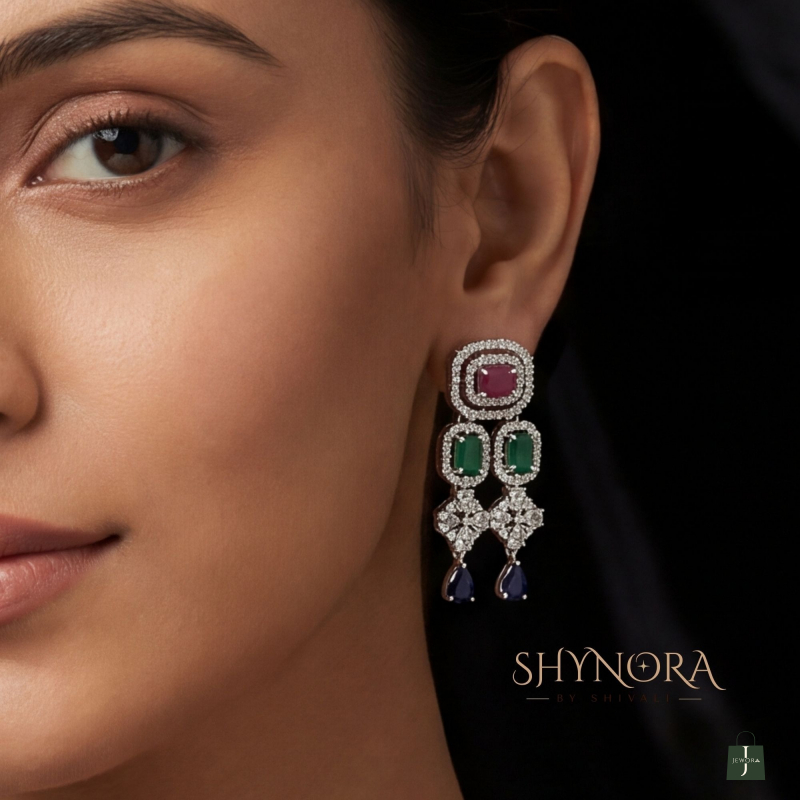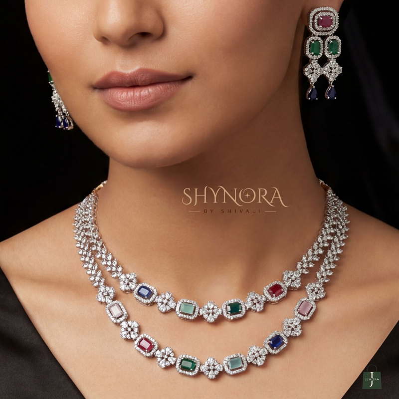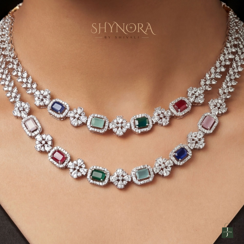 Make a statement with this elegant multicolor layered necklace set, crafted in a refined AD (American Diamond) finish. The design features two graceful layers adorned with rectangular-cut stones in rich jewel tones—ruby red, emerald green, sapphire blue, and crystal white—beautifully accented with sparkling floral diamond-style motifs.