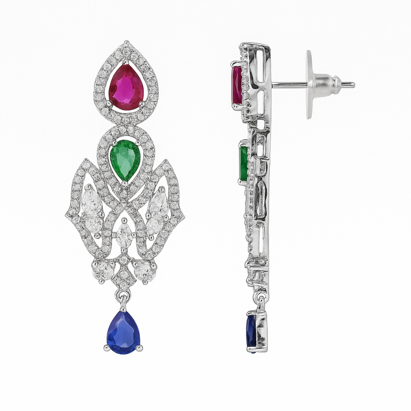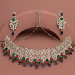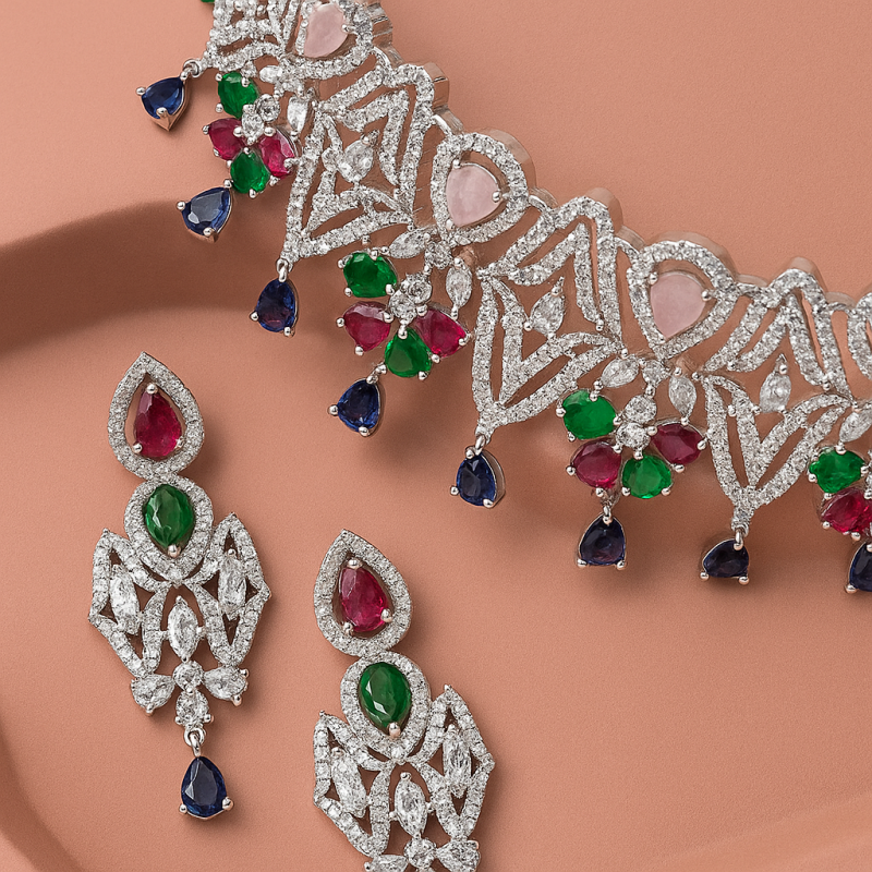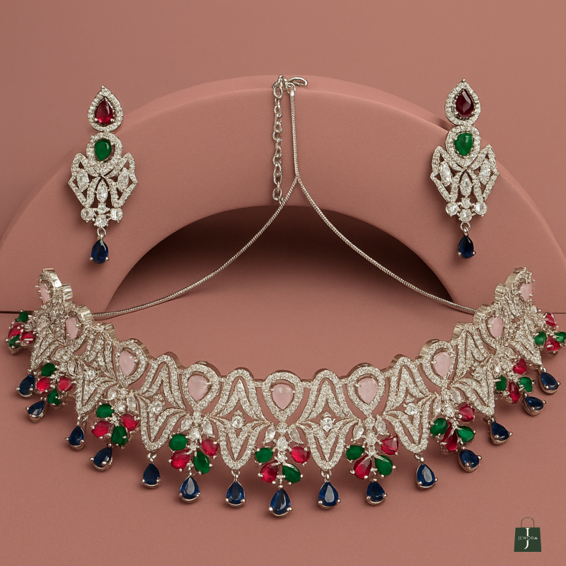 The Multicolor Stone Choker Set is an elegant and vibrant design featuring a blend of pink, green, and blue stones set in dazzling American Diamonds (CZ). The necklace has a choker-style structure with pear-shaped pink stones in the center and a scalloped CZ framework. The bottom edge is adorned with alternating drops of green and blue stones, adding a playful touch of color. The matching earrings echo the design with a pink and green stone combination, ending with a blue pear-shaped drop. Perfect for weddings, festive occasions, and cultural celebrations, this set makes a bold style statement. The combination of multicolor stones ensures versatility, allowing it to pair with a wide range of outfits.