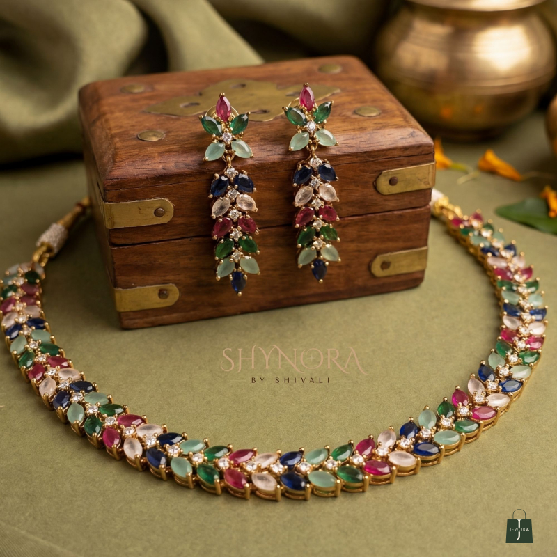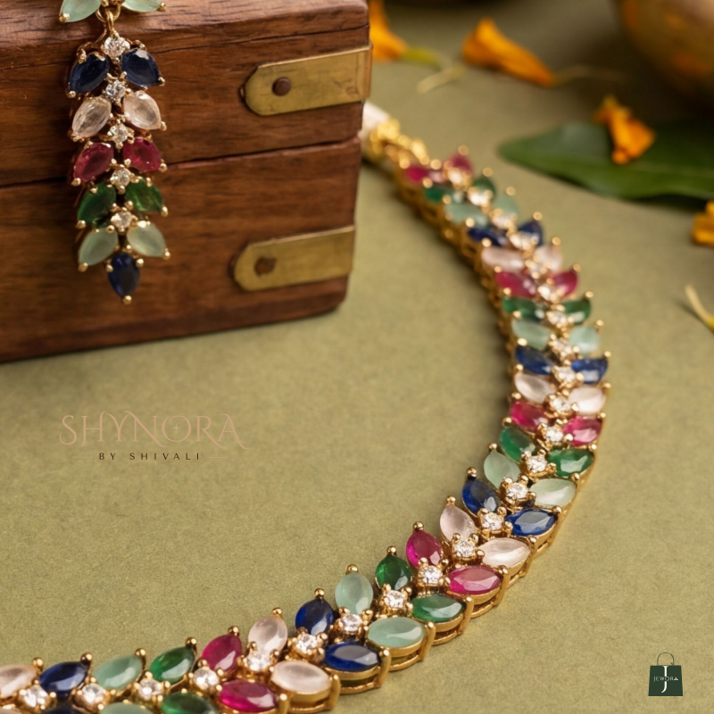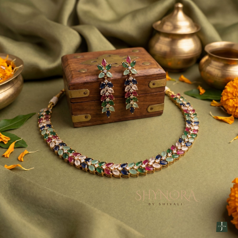 This elegant American Diamond (AD) necklace set features a beautiful multicolour stone arrangement including shades of green, blue, pink, red, and white. The sleek, close-neck design gives a graceful and modern traditional look, making it perfect for both festive and party wear.