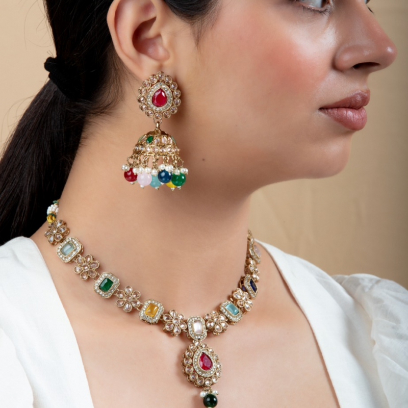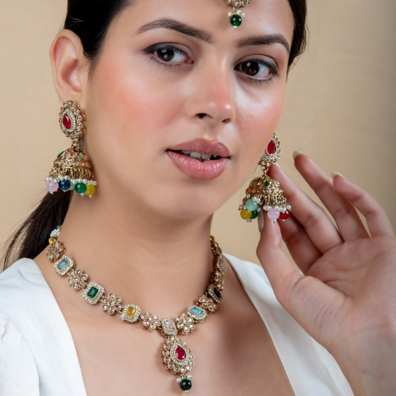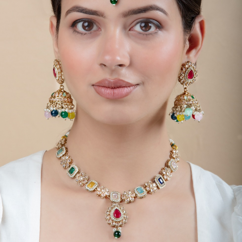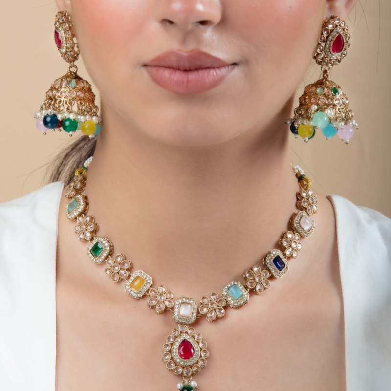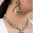 This is a stunning multicolored gemstone jewelry set, featuring a choker necklace and matching jhumka earrings. The necklace is adorned with various colored gemstones framed in gold, alternating with delicate floral motifs embedded with sparkling stones.