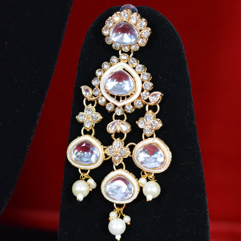 This multilayer necklace set features rows of round kundan stones arranged in a cascading formation. Small pearl drops accent the edges, adding softness and movement. The structured layering, consistent stone brilliance, and gold-toned finish together create a rich, ceremonial look with classic bridal charm.