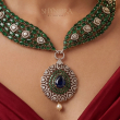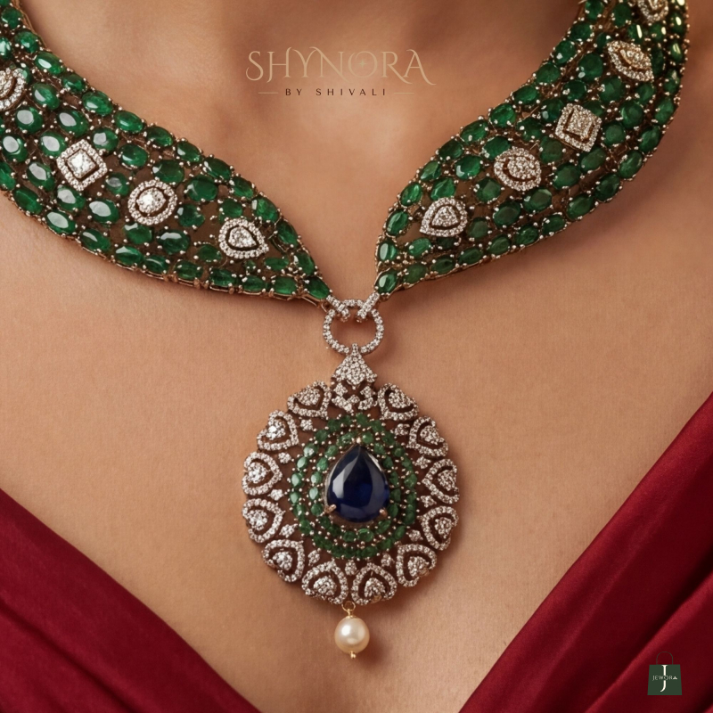 The Naayra Emerald Heritage Necklace Set is a regal blend of tradition and bold craftsmanship. Designed with lush emerald-green stones layered densely along the neckline, this statement piece flows into a striking round pendant highlighted with intricate kundan work and a deep-toned center drop for added drama.