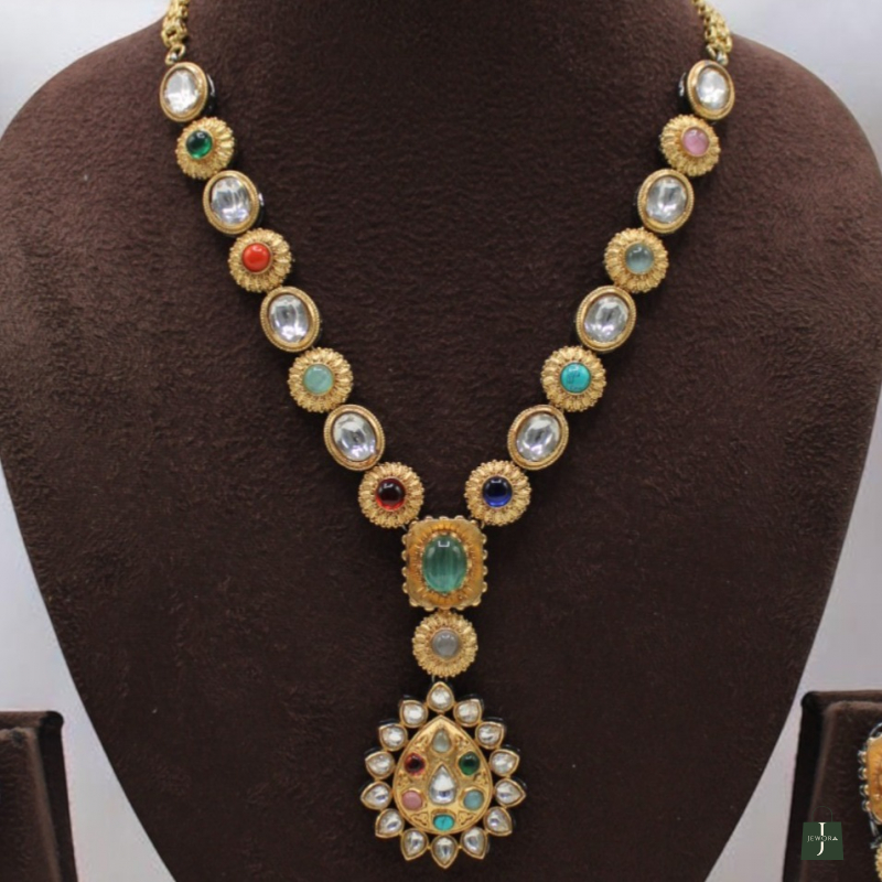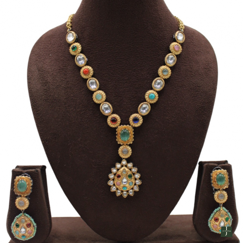 Add a touch of vibrant elegance to your traditional collection with this beautifully designed multicolour kundan necklace set. The necklace features evenly spaced oval kundan stones highlighted with colourful accent stones, leading to a stunning teardrop statement pendant. The matching drop earrings complement the necklace perfectly, creating a graceful and festive look. Ideal for weddings, festive occasions, family functions, and ethnic celebrations.