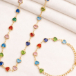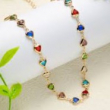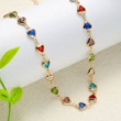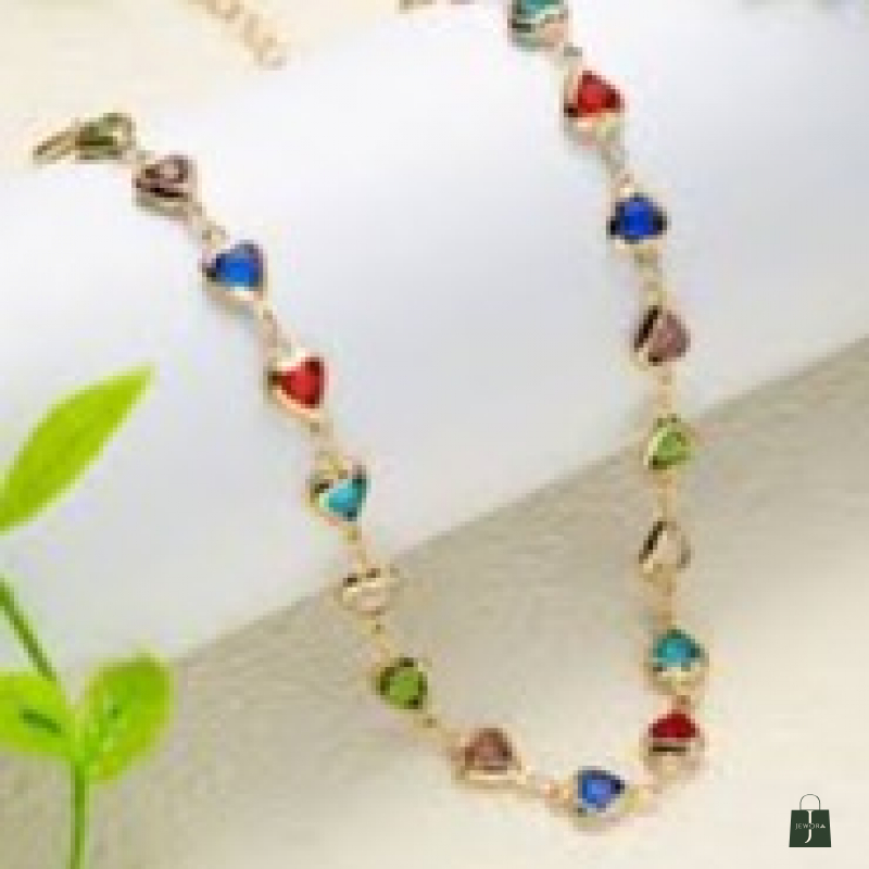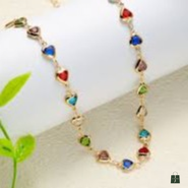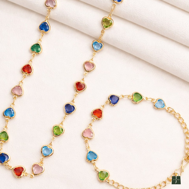 A vibrant and playful jewellery set featuring heart-shaped multi-color stones beautifully linked in a sleek gold-plated chain. The colorful stones in shades of blue, red, green, and soft pink create a cheerful yet elegant look. Lightweight and versatile, this set adds a charming pop of color to everyday outfits as well as festive ensembles. The matching bracelet completes the coordinated style, making it perfect for gifting and casual glam looks.