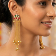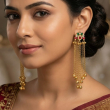 A vibrant celebration of tradition, these gold-toned Kashmiri-inspired earrings feature multicolour stone detailing with delicate cascading chains and ghungroo accents. Perfect for festive occasions, they add graceful movement and royal charm to any ethnic ensemble.