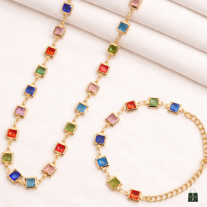 A vibrant and eye-catching jewellery set featuring square-shaped multi-color stones beautifully framed in gold-tone settings. The evenly spaced colorful stones in shades of red, green, blue, and soft pink create a bold yet elegant look. Designed for both everyday styling and festive occasions, this lightweight set adds a stylish pop of color to any outfit. The matching bracelet enhances the coordinated charm, making it perfect for gifting and casual glam looks.