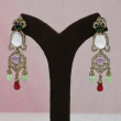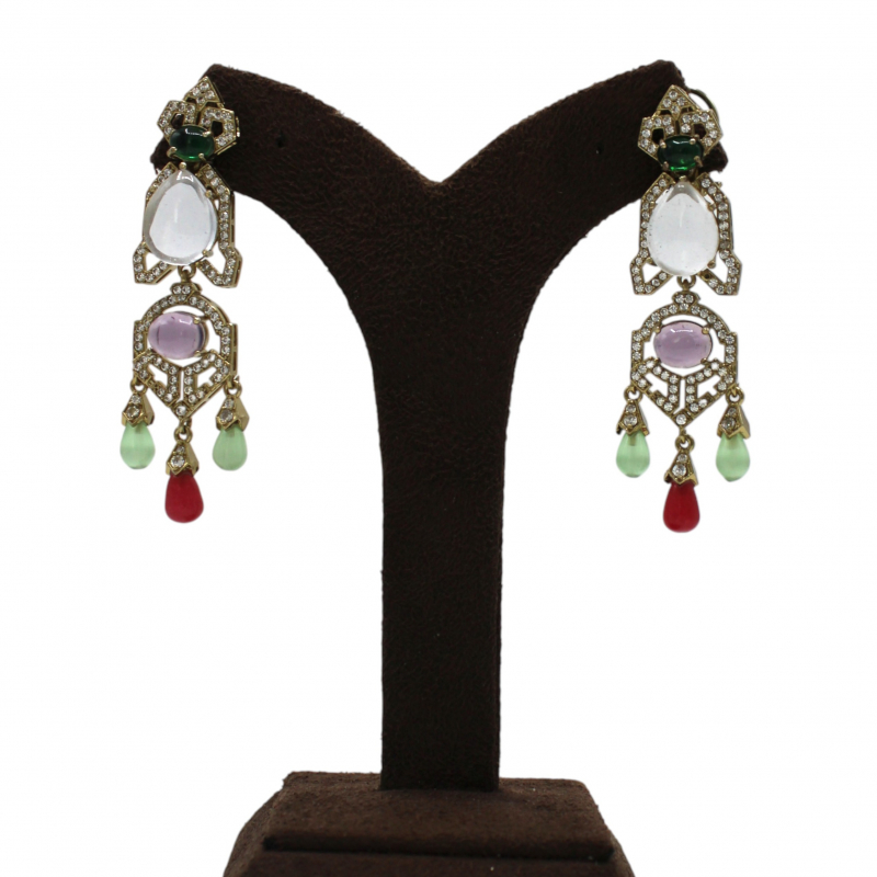The top features a deep emerald green stone, followed by a large pear-shaped white Polki centerpiece. The mid-section highlights a soft lavender oval stone enclosed in intricate gold detailing. The earrings are finished with elegant bead drops in pastel green and bold ruby red, creating graceful movement and a luxurious festive look.