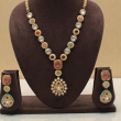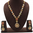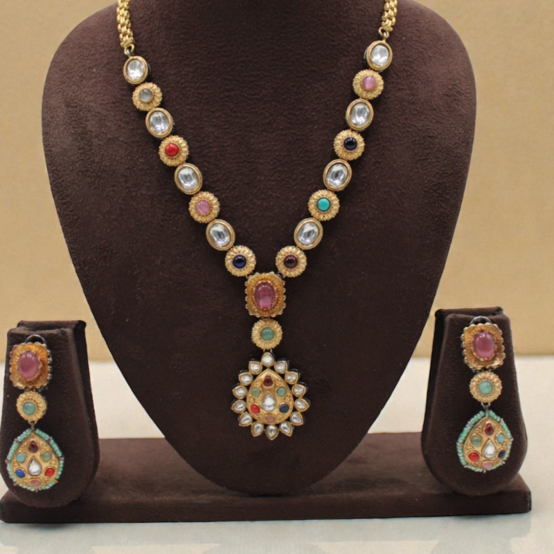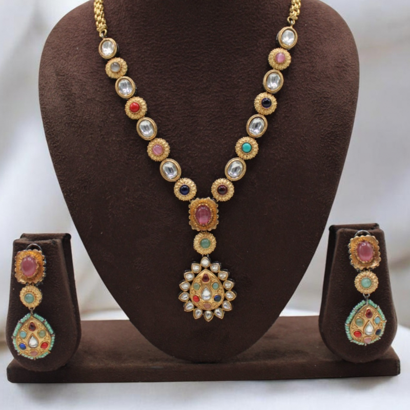 Embrace timeless elegance with this beautifully crafted Navratna-inspired long necklace set. Designed with alternating oval Kundan stones and textured round floral motifs, the necklace is adorned with vibrant multicolor stones in red, green, blue, pink, and turquoise shades. The centerpiece features a rectangular pink stone leading to a traditional teardrop pendant embellished with detailed Kundan work. Matching earrings complete this regal and festive look, making it perfect for traditional oc