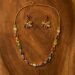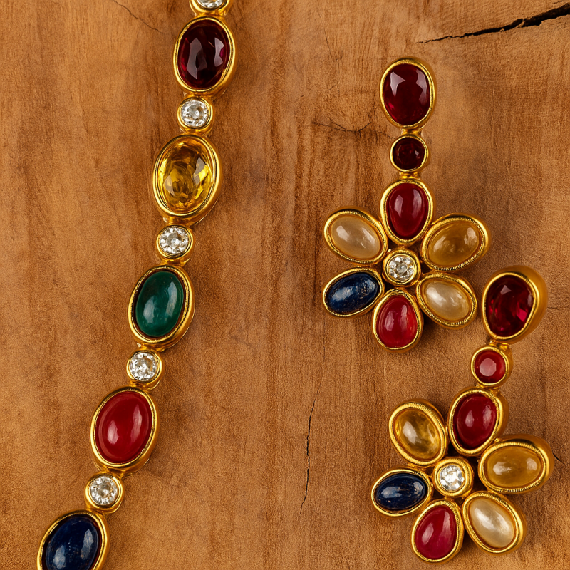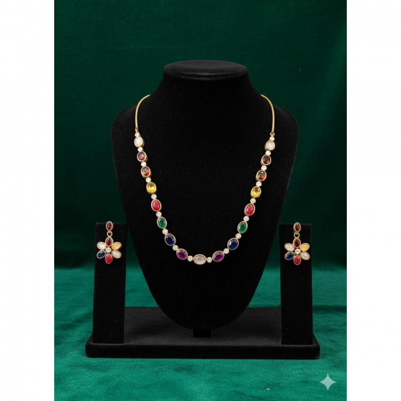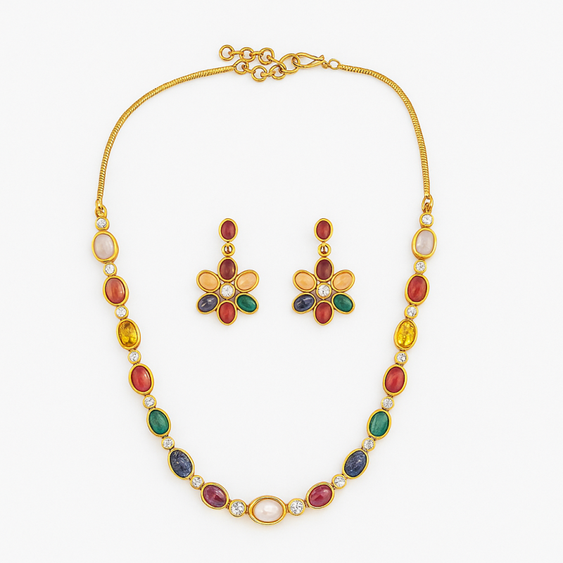 Embrace timeless tradition with the Navratna Elegance Necklace Set from Jewora. Adorned with the nine auspicious gemstones, this classic necklace radiates positivity, elegance, and heritage charm. The vibrant hues of ruby red, emerald green, sapphire blue, pearl white, and other navratna stones are beautifully set in a gold-polished base, making it a versatile piece for both festive and bridal occasions. Complemented by matching earrings, this necklace set is a symbol of prosperity and style.