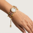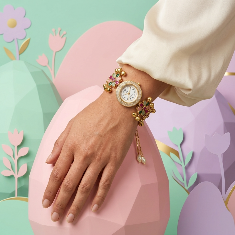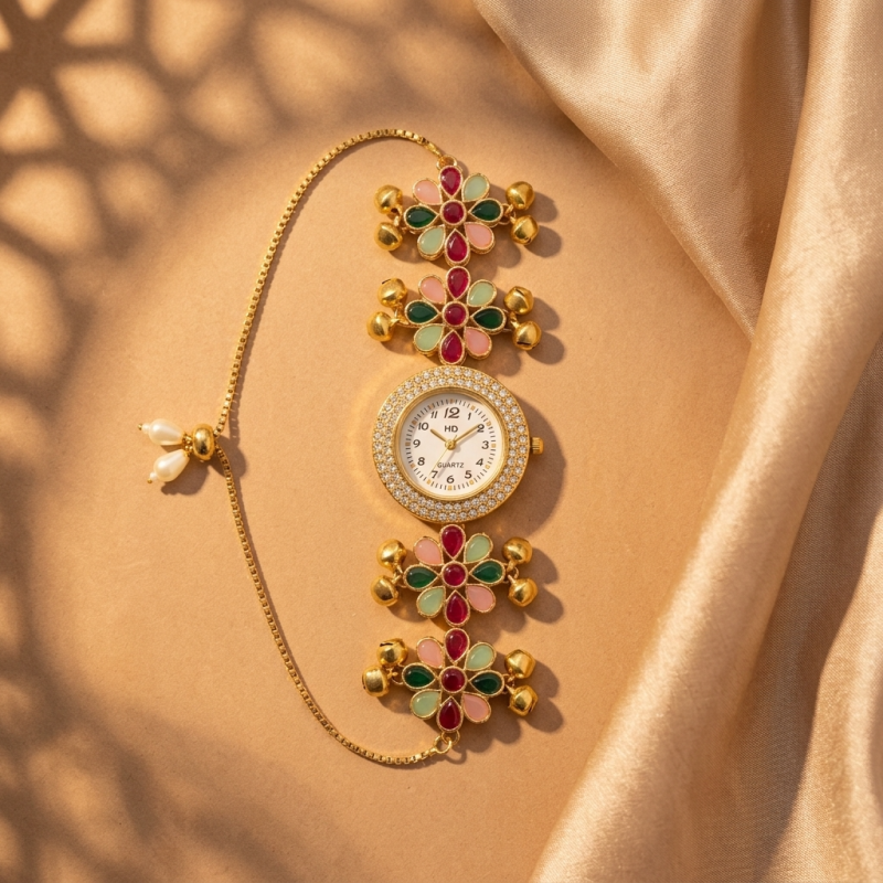 Design: Is watch mein traditional Meenakari work ke saath flower-shaped motifs diye gaye hain. Har phool mein soft pastel shades ke stones aur chote golden ghungroos hain jo isse ek ethnic charm dete hain.