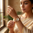 Watch Dial: Iska round dial sparkling stones se gira hua hai, jo ek luxury look deta hai.