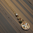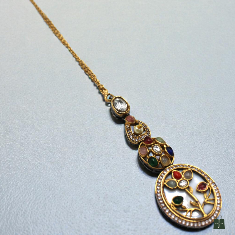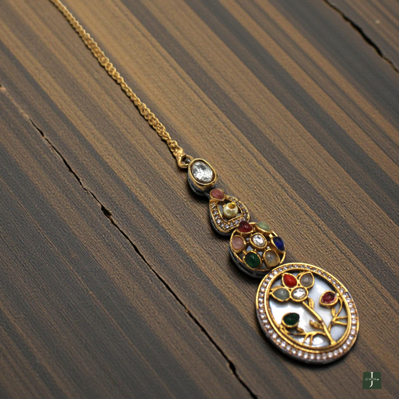 Celebrate timeless elegance with this beautifully crafted Navratna Tree Motif Pendant Maang Tikka. Designed with a delicate circular pendant, this piece features a graceful tree-inspired pattern adorned with vibrant multi-colour stones set against a light enamel-style background.