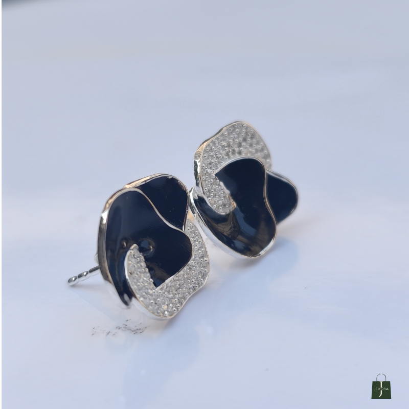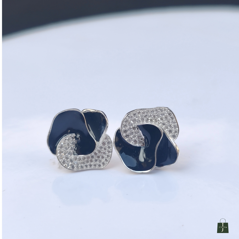Elegant swirl-shaped studs featuring deep navy enamel and shimmering CZ accents. A perfect blend of bold color and refined sparkle. Ideal for office wear, parties, and evening looks.
