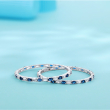 Inspired by the midnight sky and celestial beauty, the Neel Tara Kangan is a striking pair of silver-toned bangles designed to captivate. Each bangle is meticulously adorned with alternating deep sapphire-blue and brilliant white stones, reminiscent of stars twinkling against the velvet blue of the night. The stones are delicately set in a sleek, polished frame that reflects light with every movement, creating a graceful shimmer that draws the eye.