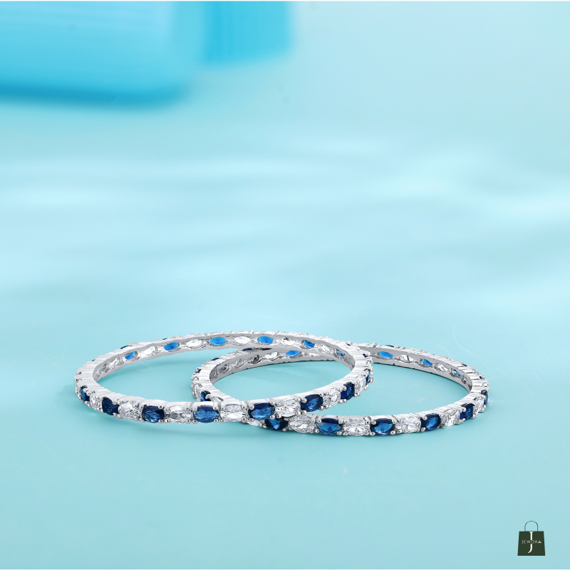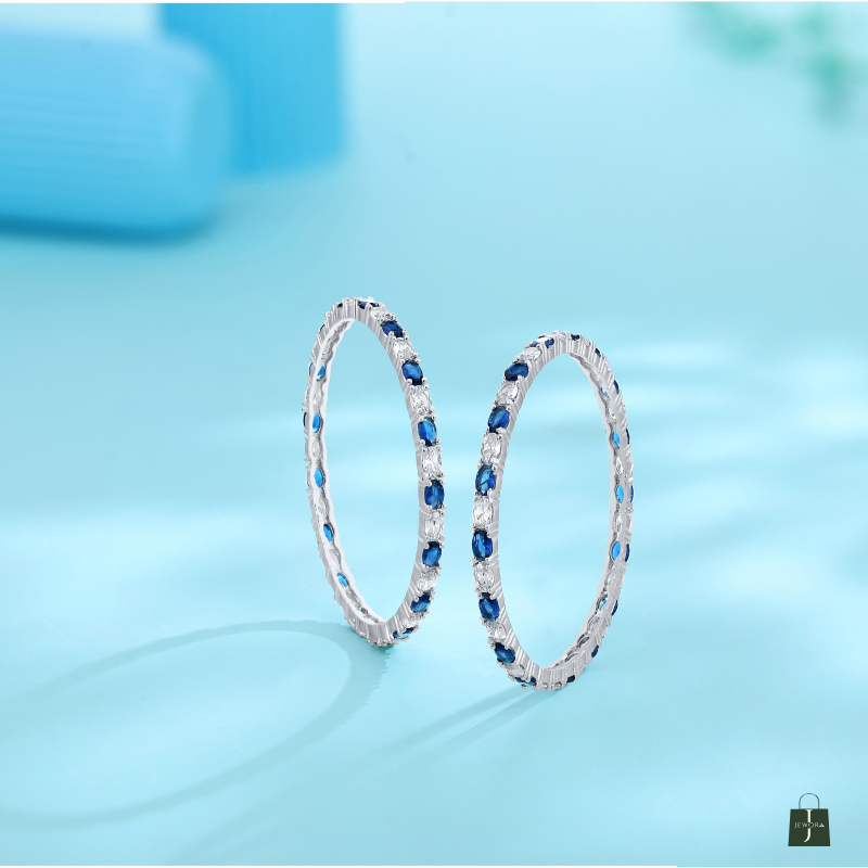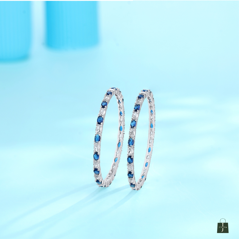 Inspired by the midnight sky and celestial beauty, the Neel Tara Kangan is a striking pair of silver-toned bangles designed to captivate. Each bangle is meticulously adorned with alternating deep sapphire-blue and brilliant white stones, reminiscent of stars twinkling against the velvet blue of the night. The stones are delicately set in a sleek, polished frame that reflects light with every movement, creating a graceful shimmer that draws the eye.