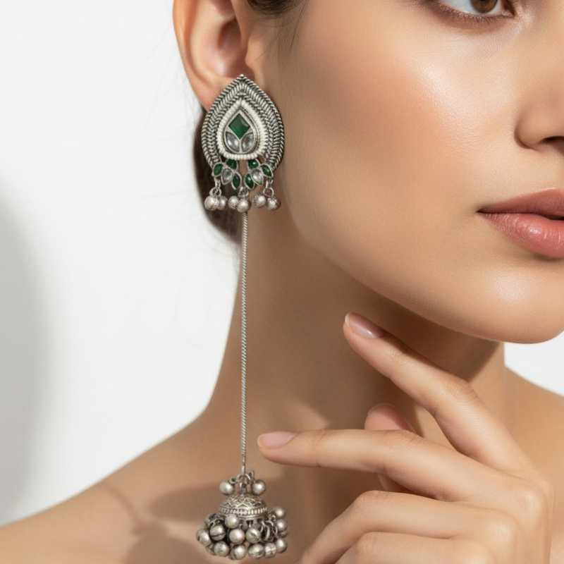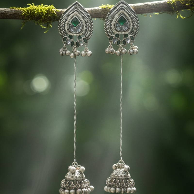 A long, slender chain connects to a finely carved jhumki dome at the bottom, adorned with clustered metallic bead drops that create graceful movement. These earrings are ideal for festive wear, cultural gatherings, and pairing with sarees, lehengas, or Indo-western outfits.