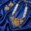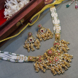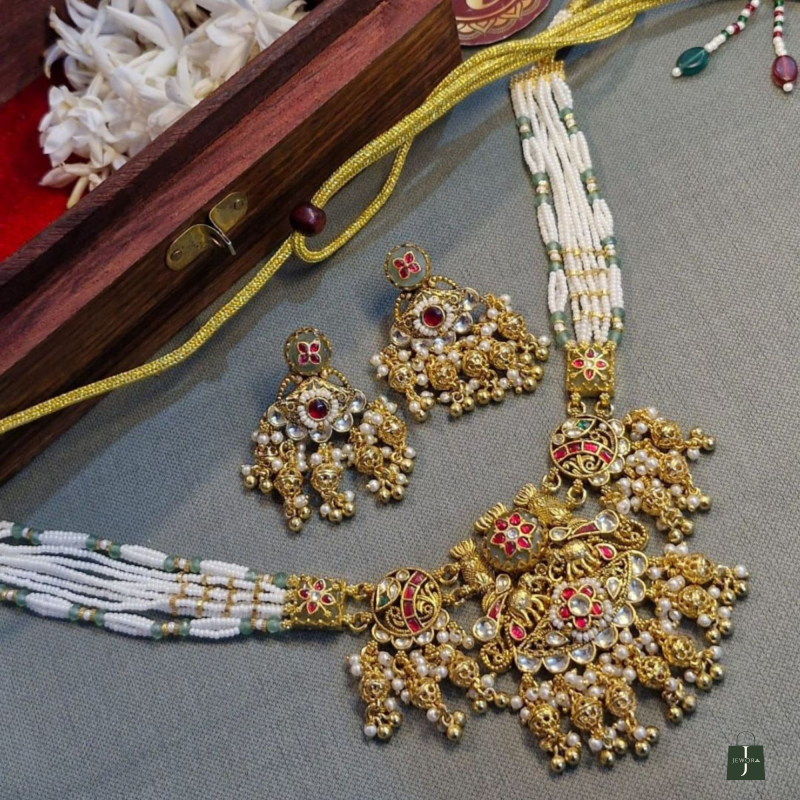 Introducing the NEELAMBARI ROYAL PEARL KUNDAN HAAR SET, a statement of timeless heritage and regal elegance. Designed with multiple strands of pristine pearls, this masterpiece is adorned with an intricately handcrafted antique-finish kundan pendant, highlighted by rich ruby-red and emerald-green enamel accents.