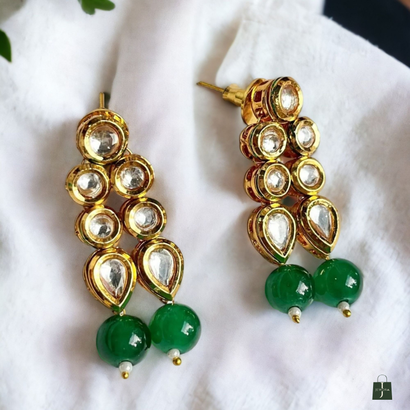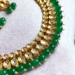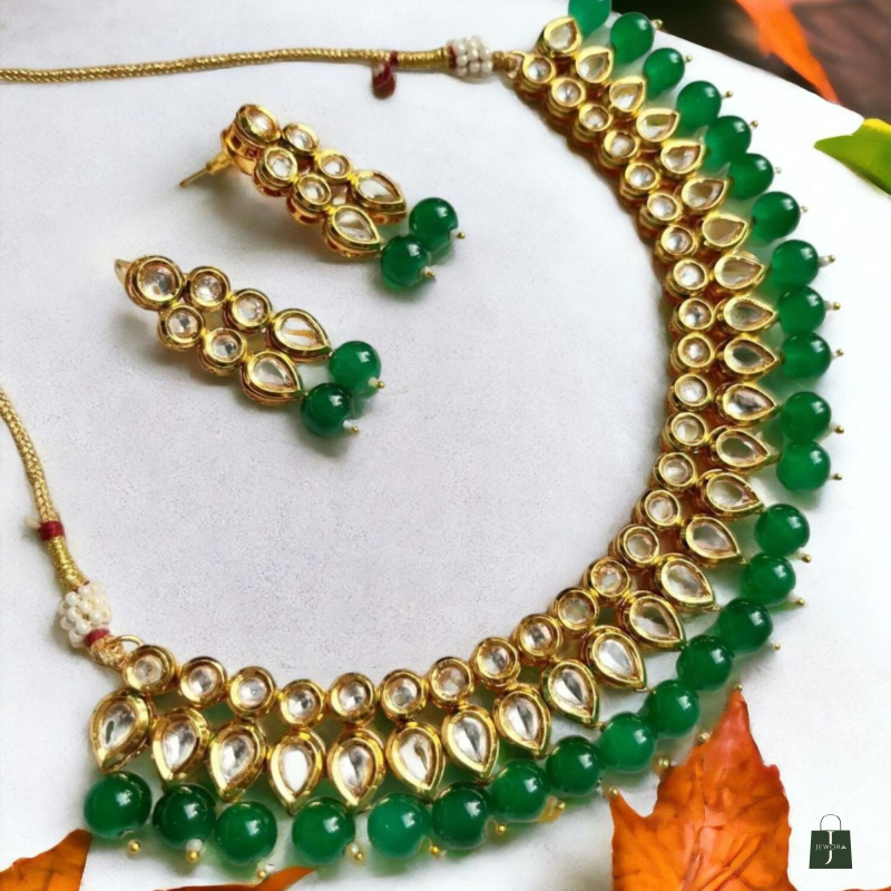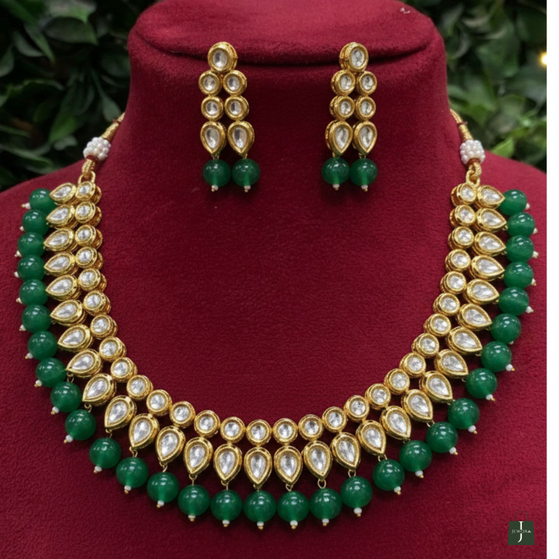 The Neerja Rajwadi Emerald Kundan Necklace Set showcases classic kundan-style diamond stones beautifully arranged in a graceful crescent design, finished with rich emerald-green bead drops. Crafted in a traditional gold-toned setting, this elegant necklace comes with matching earrings that enhance its regal charm. Ideal for weddings, festive occasions, and traditional celebrations, this timeless rajwadi set pairs perfectly with silk sarees, lehengas, and ethnic ensembles, making it a must-have for lovers of heritage-inspired jewellery.