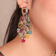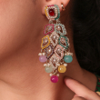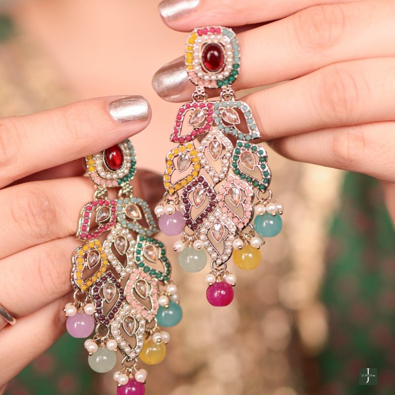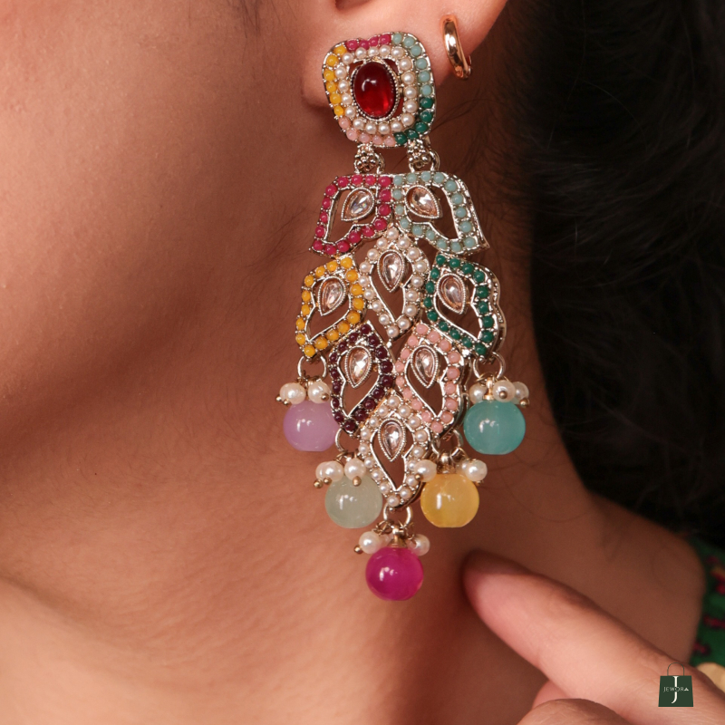 Make a bold and beautiful statement with Niharika Multicolor Royal Drop Earrings—a celebration of color, culture, and craftsmanship. These eye-catching earrings feature a stunning medley of pastel and jewel-toned stones, arranged in a cascading peacock feather-inspired design. Accented with pearls and intricate Kundan-style motifs, the Niharika earrings embody regal charm with a contemporary twist.