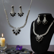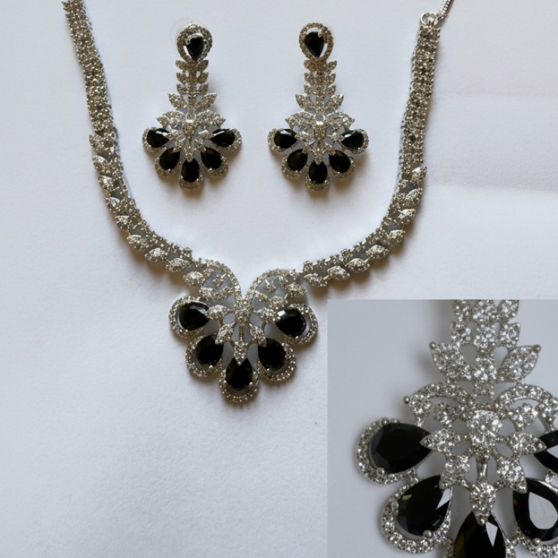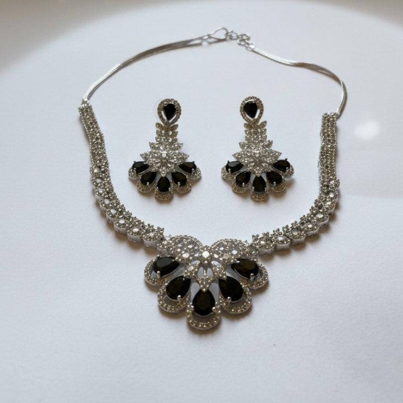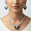 Step into timeless glamour with the Noir Blossom Diamond Statement Necklace Set. Designed in a refined silver-tone finish, this exquisite set features a delicate leaf-pattern chain leading to a bold floral centerpiece. The pendant is beautifully crafted with sparkling cubic zirconia stones forming a radiant flower motif, highlighted with glossy black teardrop stones for a striking contrast.