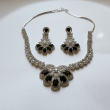 The matching chandelier-style earrings mirror the same floral elegance with black stone accents, making this set perfect for evening occasions, receptions, and cocktail events. A graceful blend of sophistication and bold charm.
