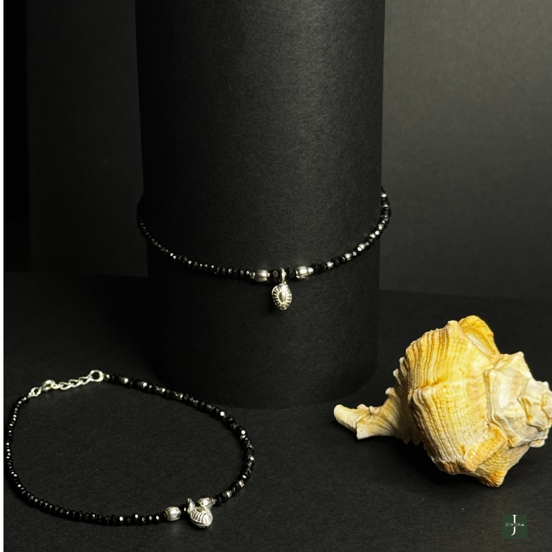 A stunning anklet adorned with black beads and a silver charm, perfect for subtle elegance and everyday style.