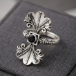 "Oxidised silver adjustable ring with an ornate cross‑floral design and a central black gemstone. Perfect for boho or traditional outfits, this statement piece adds vintage charm to any ensemble."