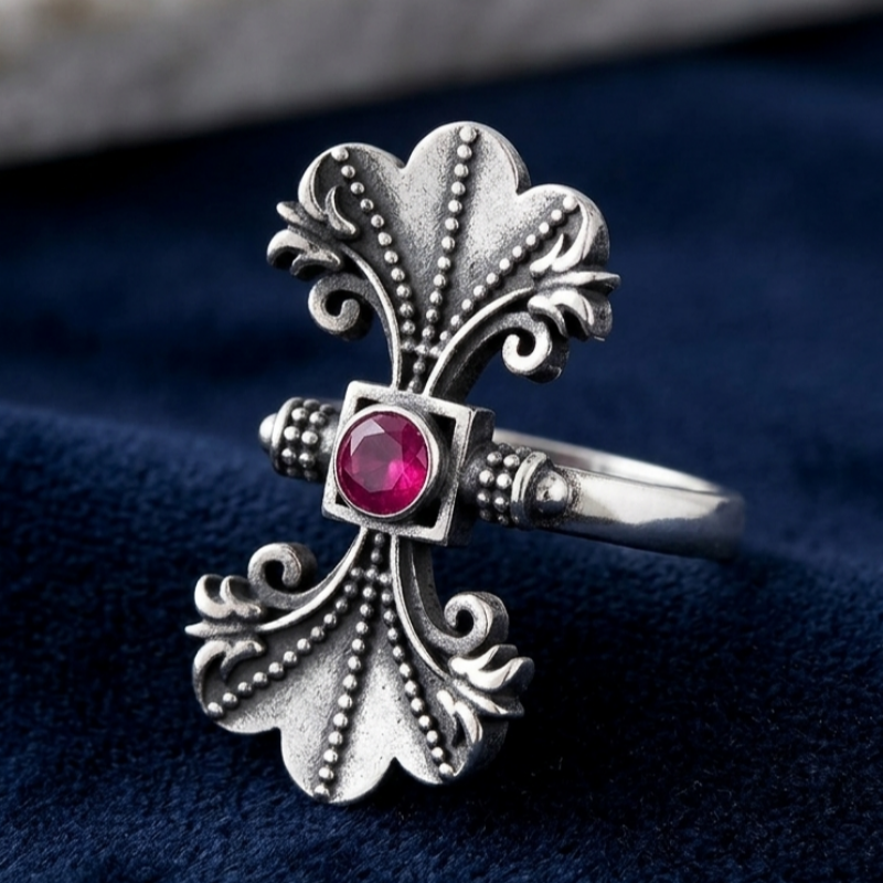 "Oxidised silver adjustable ring with an ornate cross‑floral design and a central black gemstone. Perfect for boho or traditional outfits, this statement piece adds vintage charm to any ensemble."