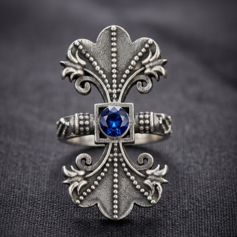 "Oxidised silver adjustable ring with an ornate cross‑floral design and a central black gemstone. Perfect for boho or traditional outfits, this statement piece adds vintage charm to any ensemble."