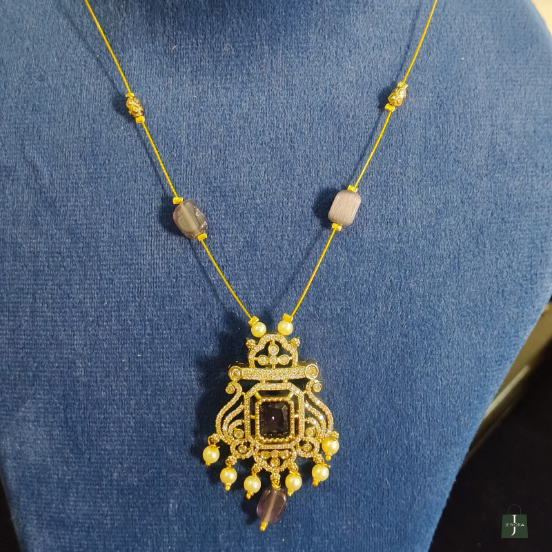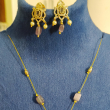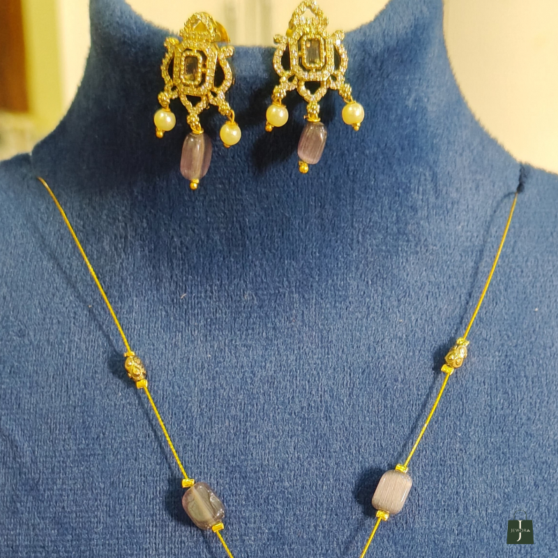 The necklace chain is minimal yet elegant, highlighted with matching amethyst beads that add balance and charm. The earrings mirror the pendant design with pearl accents and stone drops, making this set perfect for festive, wedding, and traditional occasions.
