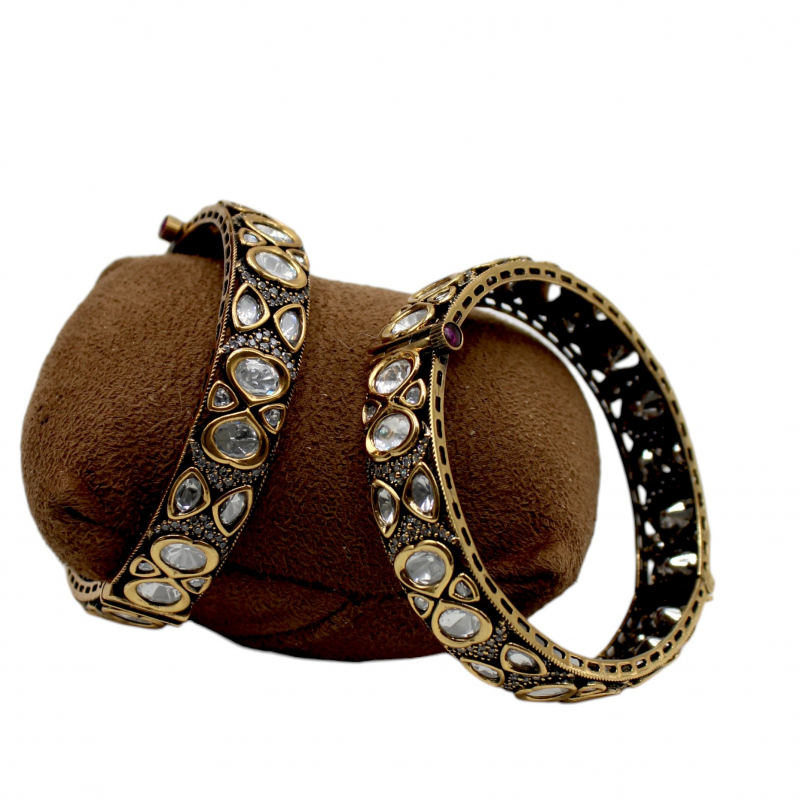 Add a bold royal touch to your jewellery collection with the Noor Antique Polki Kada Set. Designed with intricate uncut-style polki stones, these kadas feature a stunning antique gold finish that enhances their traditional charm.