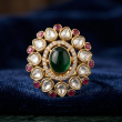 A stunning gold-toned adjustable ring featuring a circular design with a central oval stone surrounded by eight oval clear Kundan stones. Each Kundan stone is encircled with tiny sparkling zirconia accents, adding luxurious brilliance to the piece. Ideal for festive or everyday glamour, this ring offers elegant, traditional Indian craftsmanship with a modern touch.