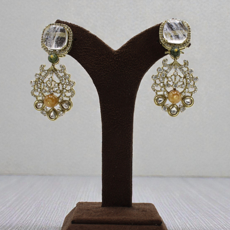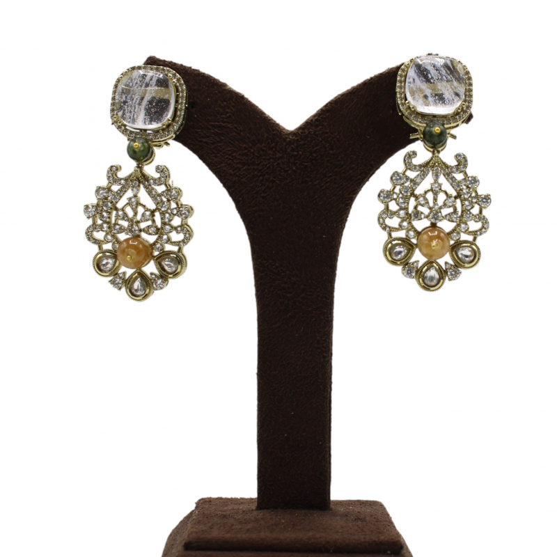 The lower portion showcases intricate filigree work adorned with sparkling white stones, delicate teardrop polki accents, and a warm amber-toned center stone. A subtle green bead detail connects the top and drop design, enhancing the overall elegance.
