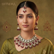 Delicate ruby bead drops add movement and drama, while the intricate stone layering gives the necklace a regal, handcrafted finish. The set is completed with statement jhumka-style earrings and a matching teardrop maang tikka, making it a perfect bridal and festive showstopper.
