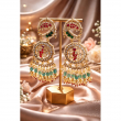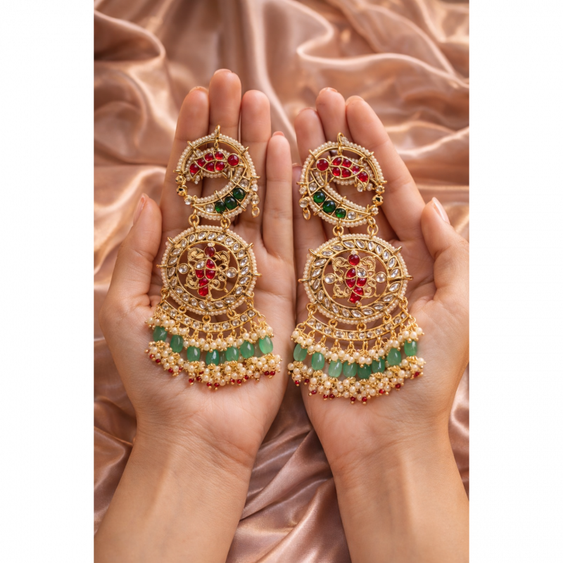 The Noor-e-Kashmir Jhumkas are adorned with a stunning arrangement of red β€οΈ and emerald-green π stones that bring vibrancy and richness to the design.