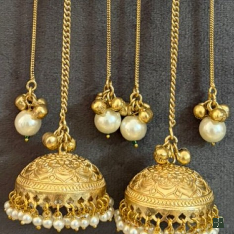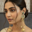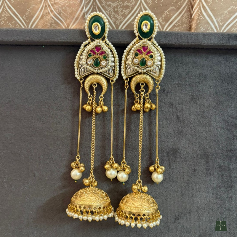 A tribute to timeless Indian artistry. These earrings feature a sophisticated arrangement of multi-tonal stones and golden filigree. The dramatic length and rich pearl detailing make them an essential statement piece for weddings and grand festivities. Experience luxury in every detail."