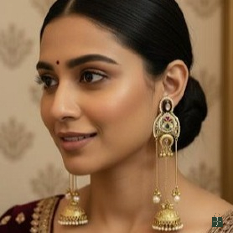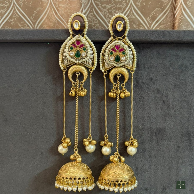 A tribute to timeless Indian artistry. These earrings feature a sophisticated arrangement of multi-tonal stones and golden filigree. The dramatic length and rich pearl detailing make them an essential statement piece for weddings and grand festivities. Experience luxury in every detail."