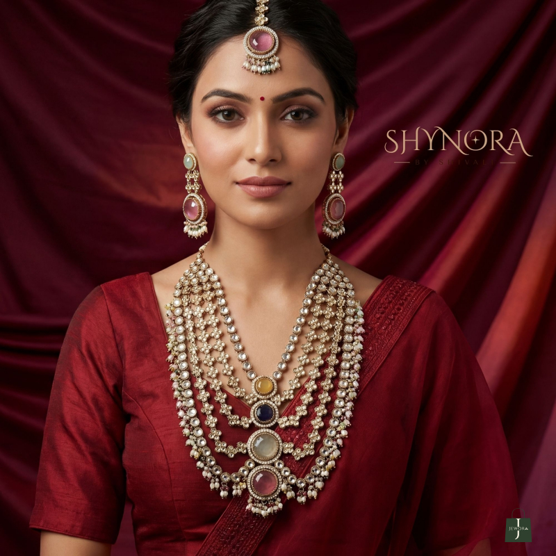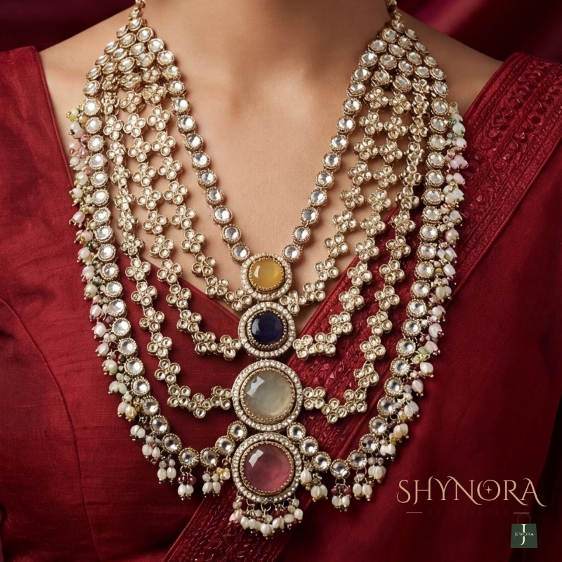 The Noor-e-Rang Multi-Layer Kundan Necklace Set is a striking blend of tradition and color harmony. This regal necklace features multiple cascading kundan strands beautifully layered and centered with round statement stones in soft multicolor tones—including rose, ivory, midnight blue, and amber hues.